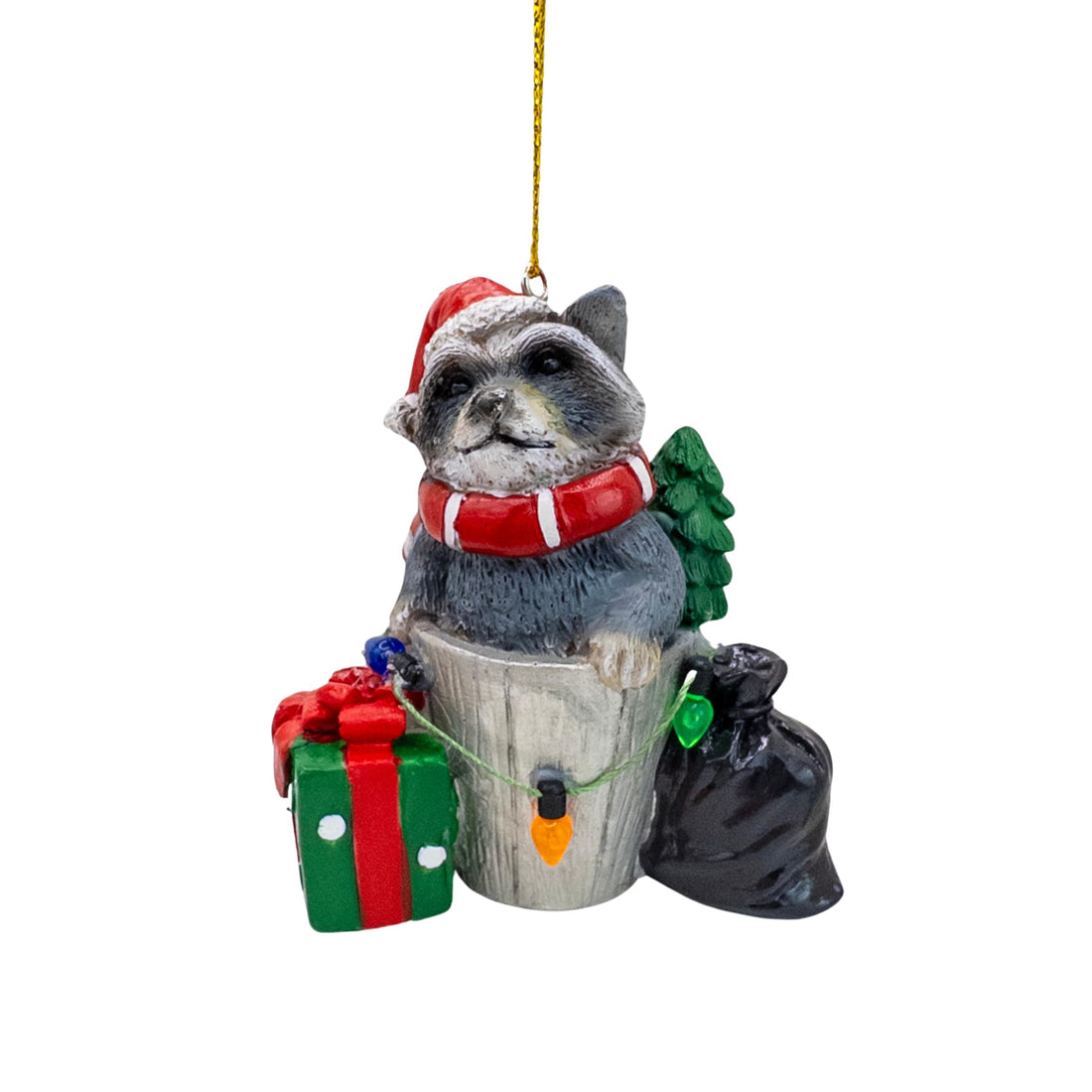 Racoon Celebrating Holidays with Lights Presents Trash Can Christmas Tree Ornament
