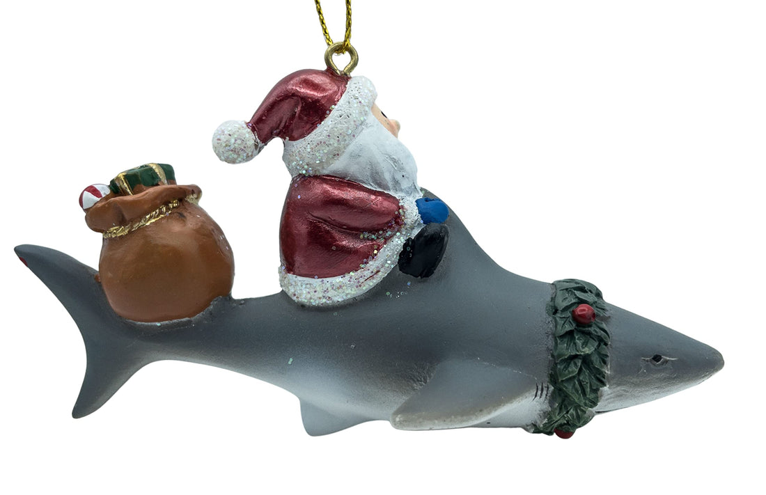 Santa Riding a Shark Delivering Bag of Presents Christmas Tree Ornament