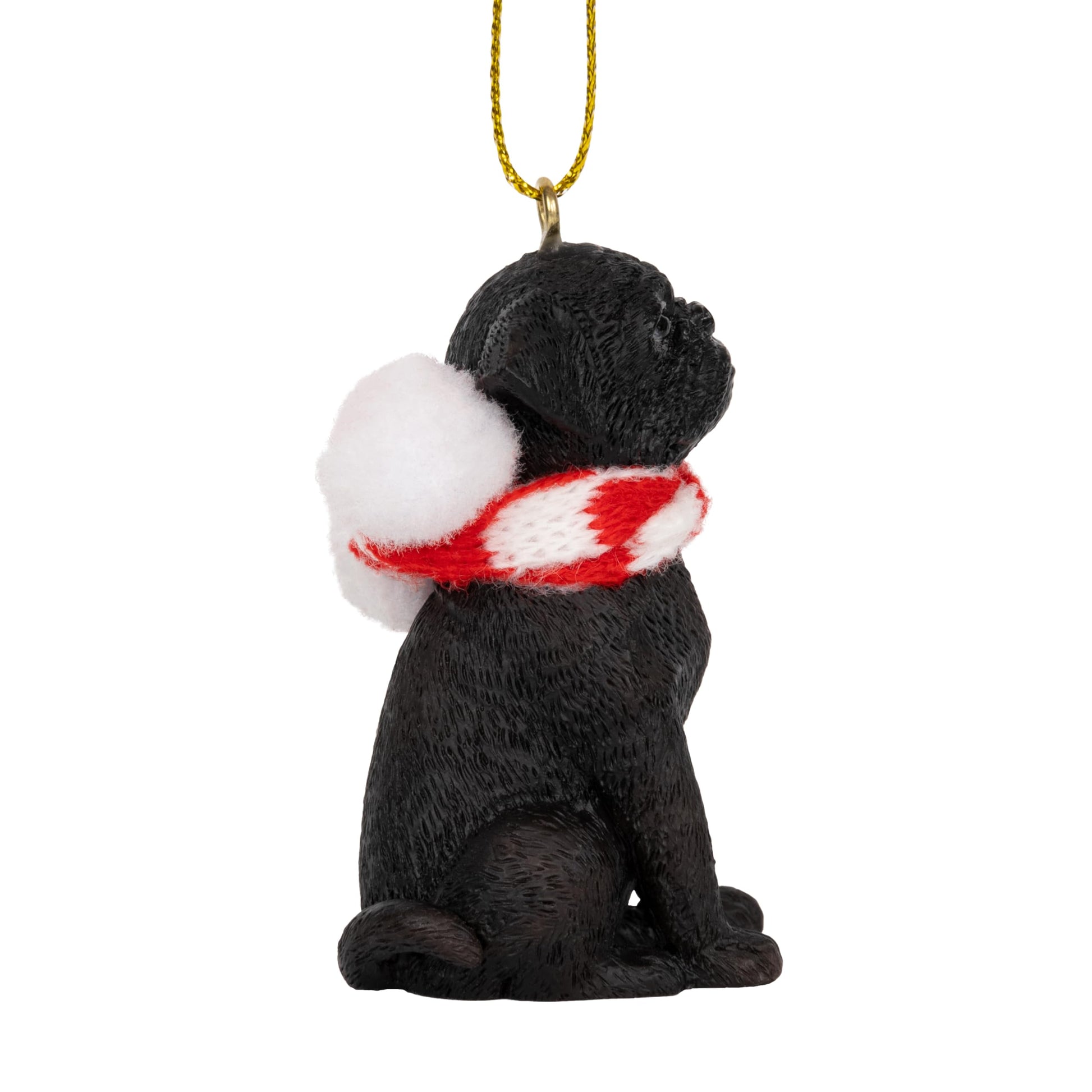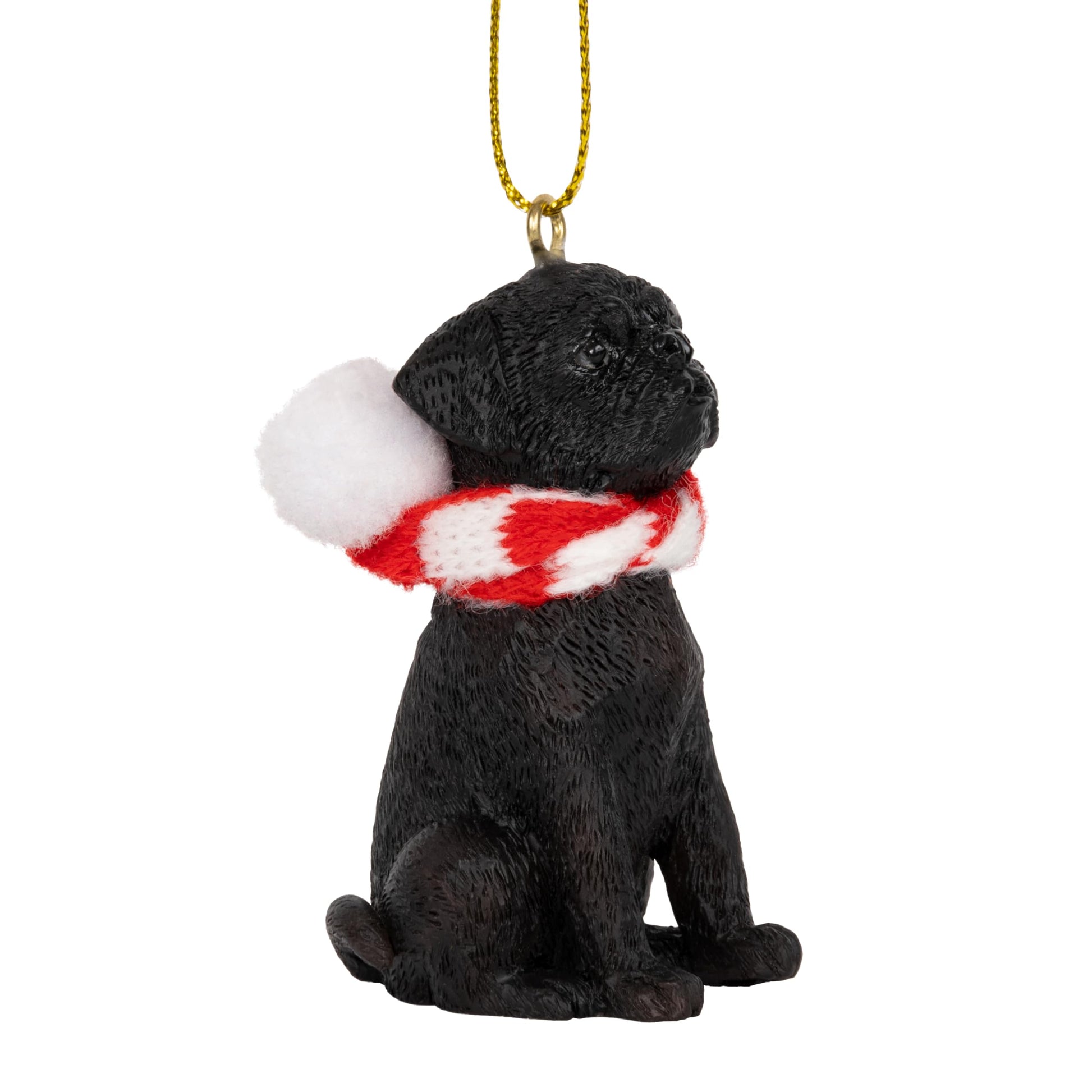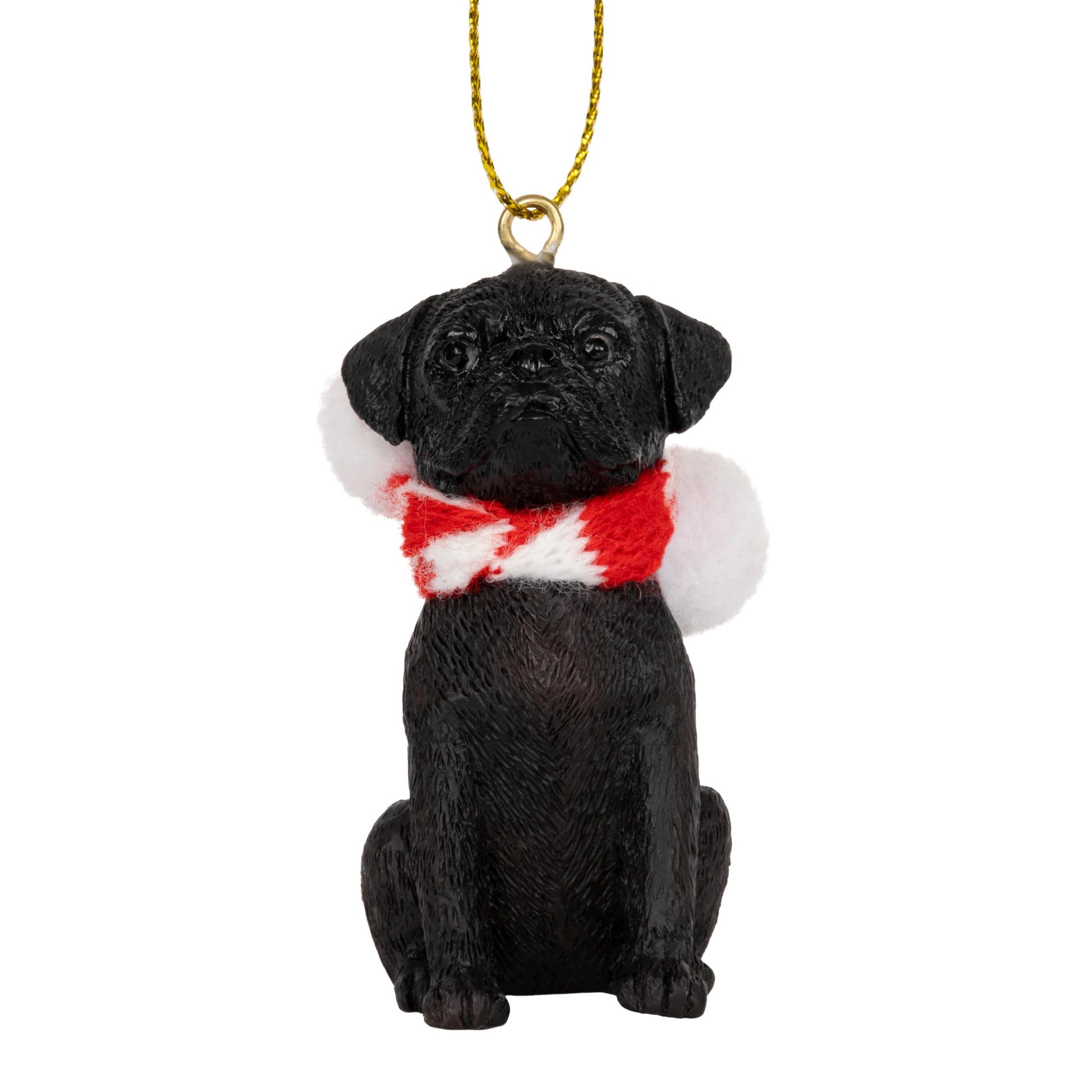 Black Pug Dog Christmas Tree Ornament with Fabric Candy Cane Scarf