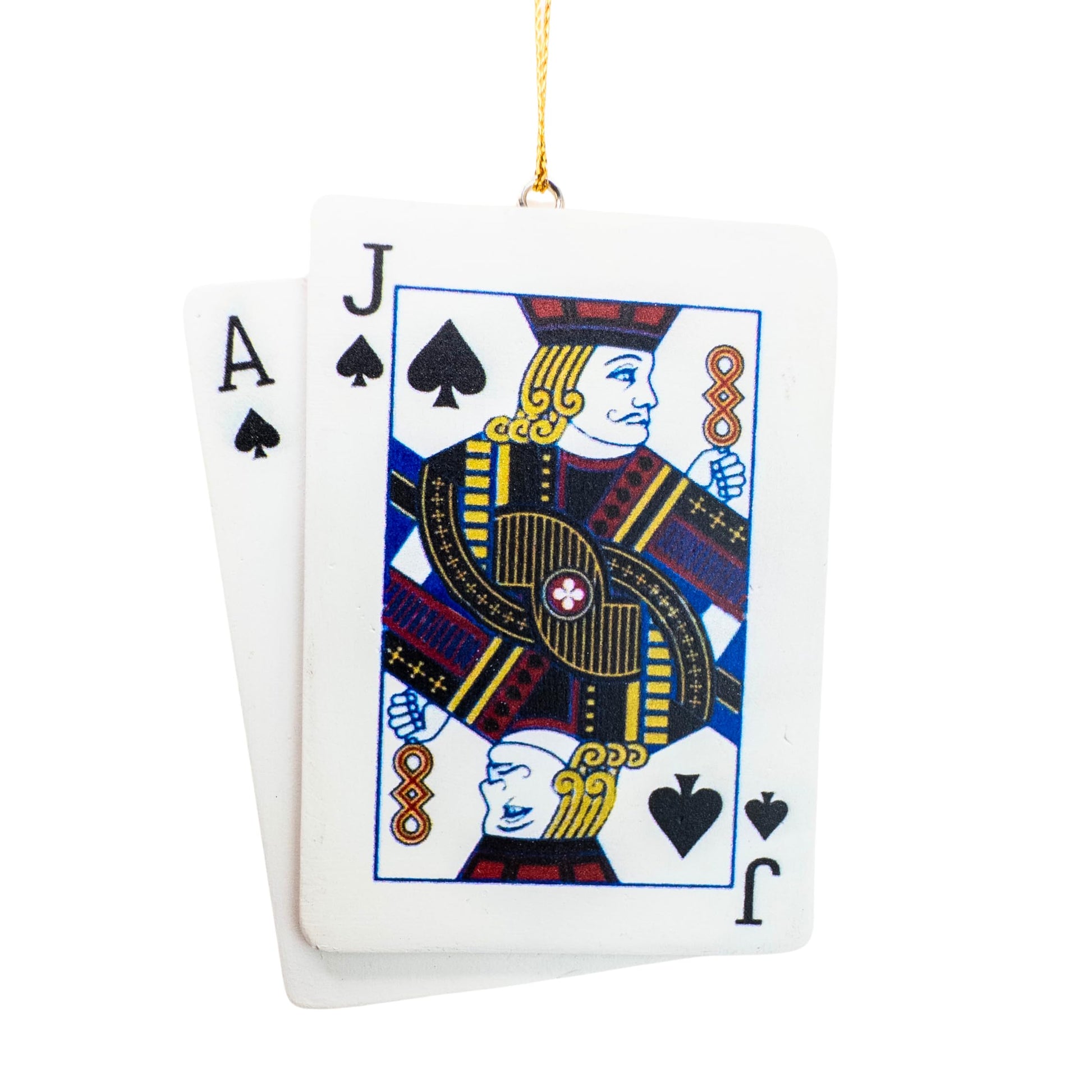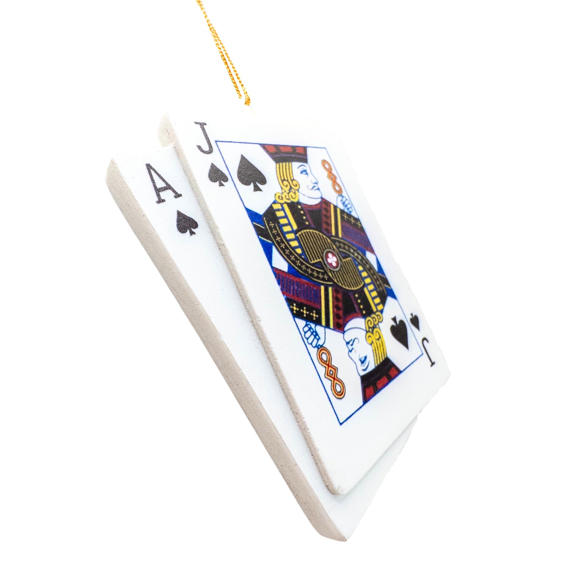 Details: Bring some casino fun to your holiday decor with this stylish Blackjack Card Christmas Tree Ornament! Featuring a winning hand of blackjack, this ornament showcases the iconic Ace and Jack of spades and hearts on the other side, making it a perfect gift for card game enthusiasts or anyone who loves the thrill of the casino. Crafted with attention to detail, it adds a touch of elegance and excitement to your tree. Made from durable resin materials, this lightweight ornament is easy to hang and sure to stand out as a unique addition to your holiday decor. Whether you're a card shark or just enjoy a bit of luck, this ornament is a festive winner! Weight 2.5 ounces. Size in inches 3.5 height, 2.75 length, 0.25 width
