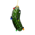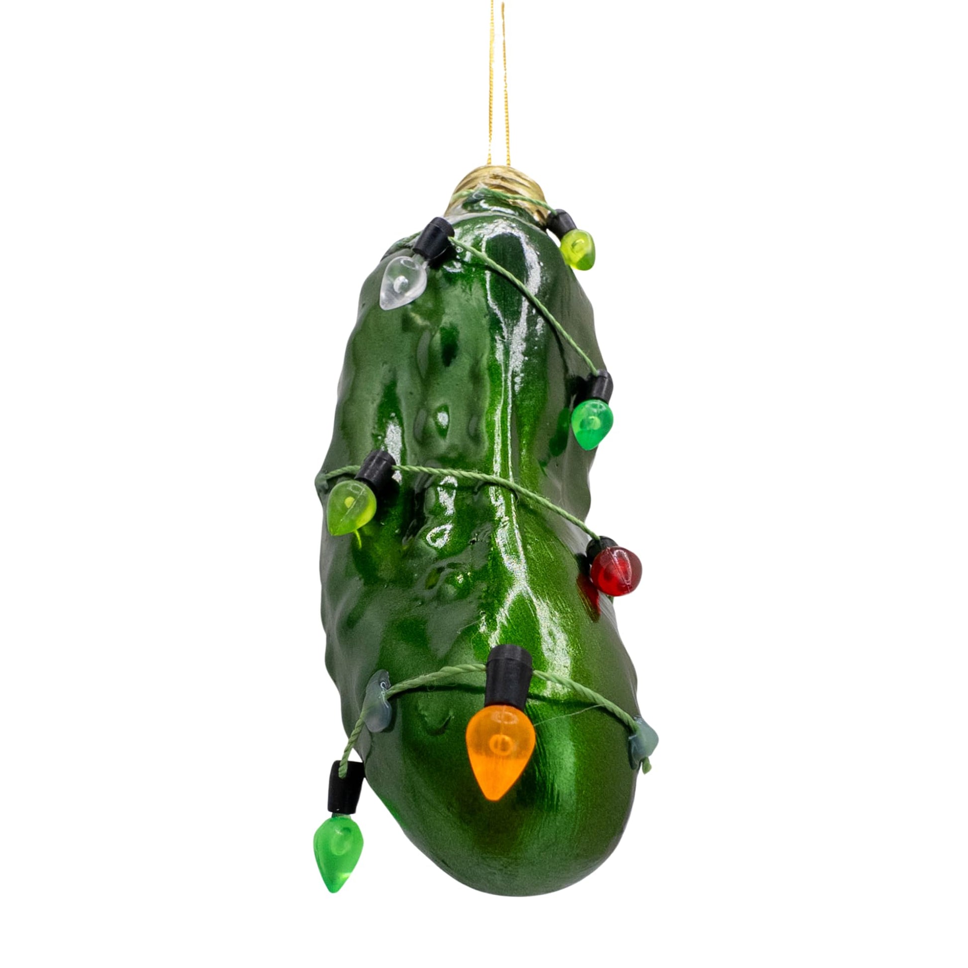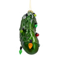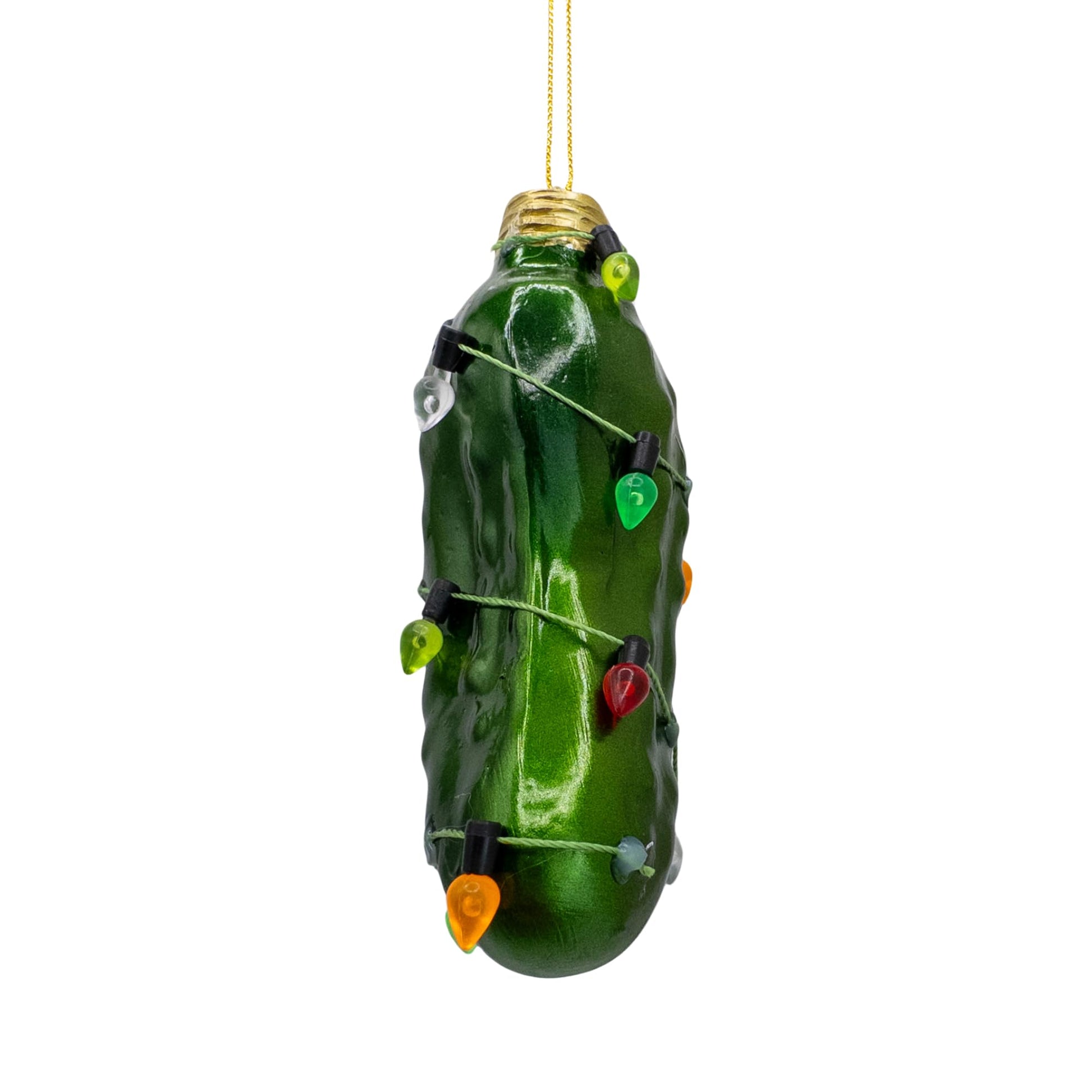 Details: Add a playful twist to your holiday decor with this charming pickle ornament wrapped in twinkling Christmas lights! Crafted with attention to detail, this quirky ornament features a shiny, green pickle adorned with a delicate string of colorful plastic lights, bringing a touch of fun to your Christmas tree. It's the perfect blend of tradition and humor, ideal for starting conversations or adding a unique flair to your ornament collection. Celebrate the season with this delightful pickle ornament that will bring a smile to everyone's face! Weight 2.8 ounces Size in inches 4.25 height, 1 length,1 width