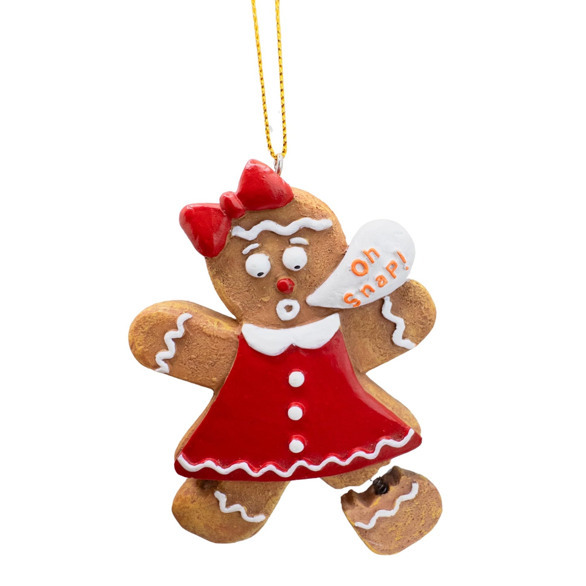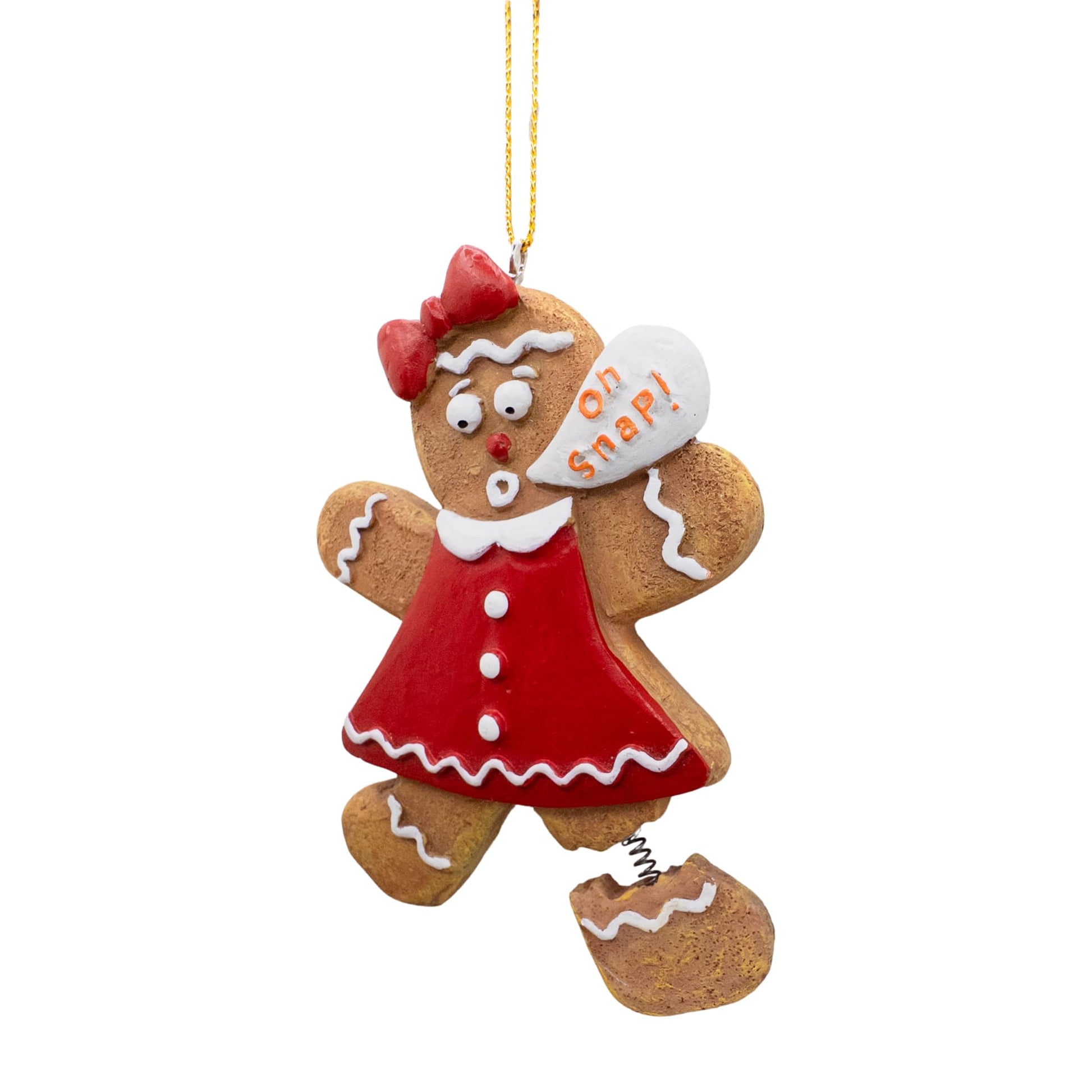 Details: Bring some festive humor to your tree with the Gingerbread Woman Cookie "Oh Snap!" Broken Leg Funny Christmas Tree Ornament! Featuring a gingerbread woman with a broken leg and a playful "Oh Snap!" caption, this ornament adds a humorous touch to your holiday decor. The adorable design captures a lighthearted holiday mishap, perfect for those who love quirky and fun decorations. Crafted from durable, lightweight materials, it's easy to hang and built to last for many holiday seasons. Whether for your own tree or as a fun gift, this ornament is sure to bring laughter and holiday cheer! Weight 2.0 oucnes, Size in inches 3.75 in height, 2.62 in length and 0.37 in width