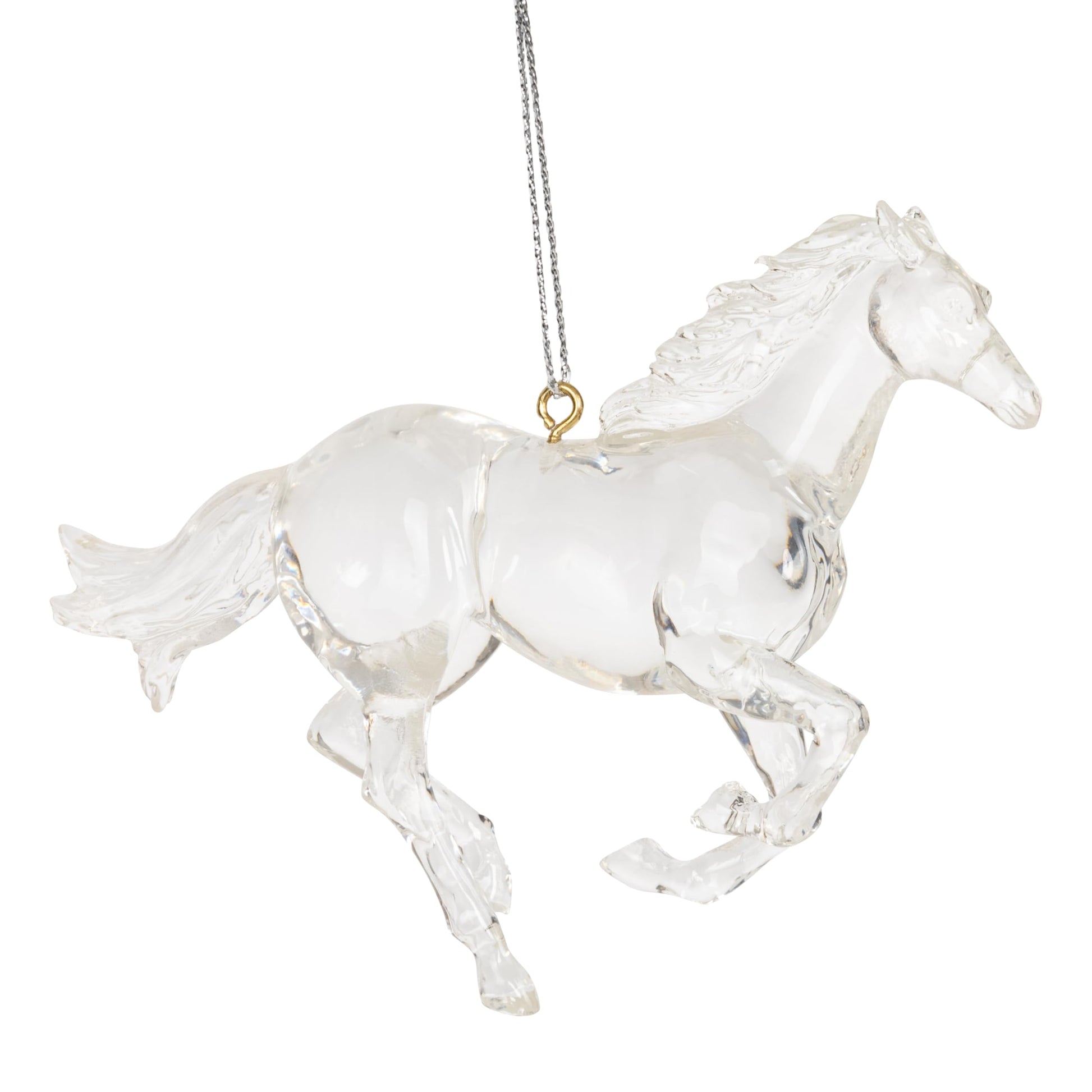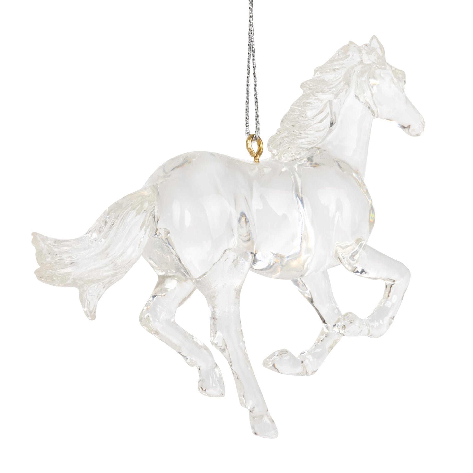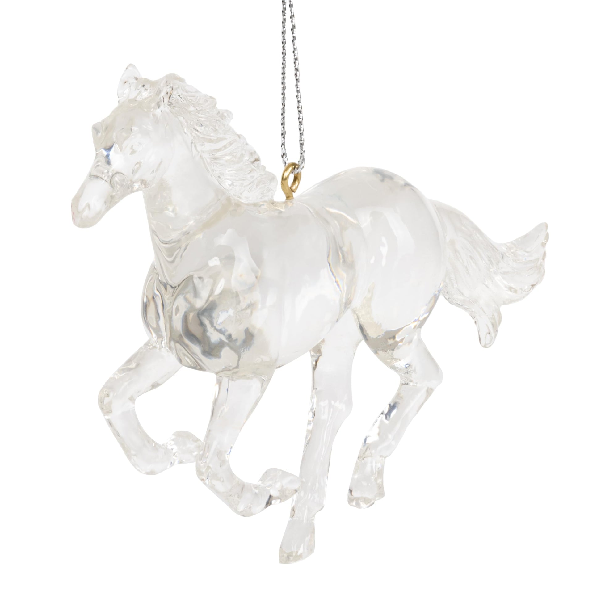 Details: This stallion horse clear ornament captures the graceful essence of these majestic creatures with exquisite detail and transparency. Crafted from high-quality resin, this ornament allows light to dance through its delicate contours, creating a mesmerizing display of luminosity. The sleek lines and gentle curves of the horse's form are elegantly rendered, capturing the spirit of freedom and elegance associated with these beloved animals. Whether hung on a Christmas tree, displayed in a sunlit window, or adorning a decorative stand, this clear horse ornament adds a touch of enchantment to any space. Perfect for horse enthusiasts, nature lovers, or anyone who appreciates the beauty of fine craftsmanship, this ornament is sure to become a cherished keepsake for years to come. Size 4 1/4 inches in length by 3 1/2 inches in height