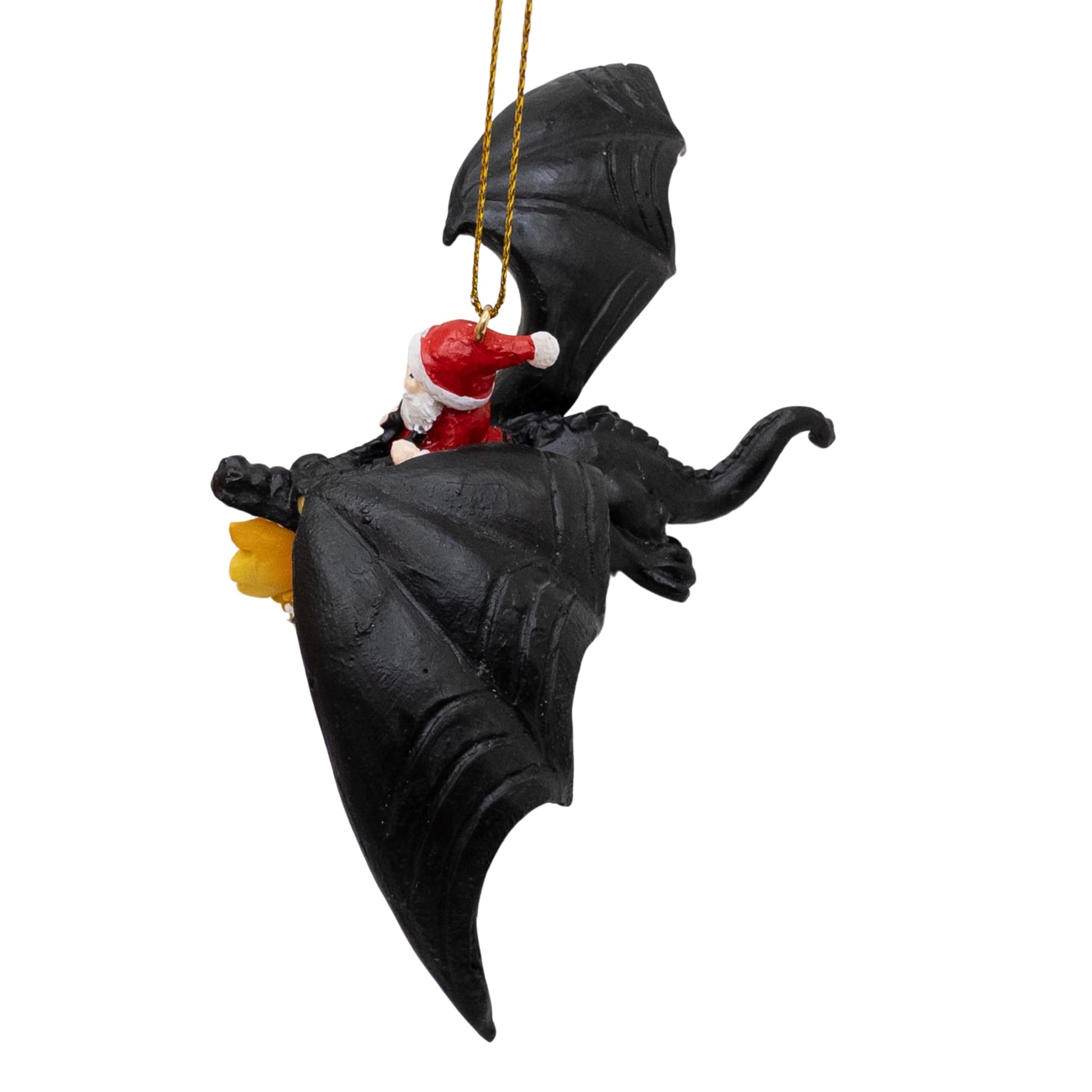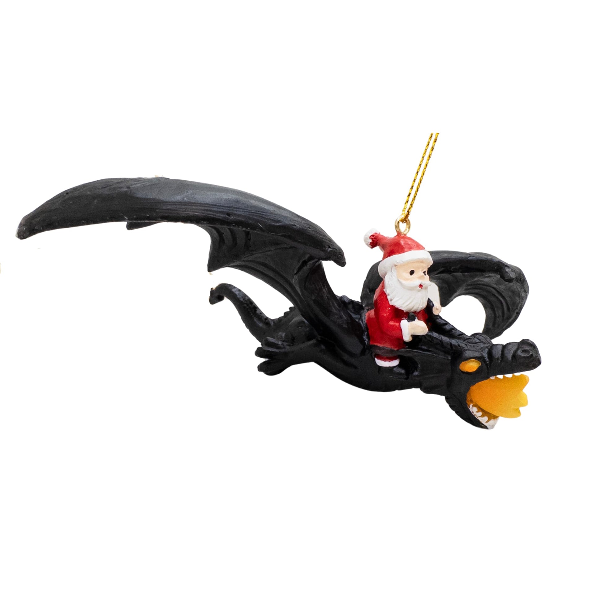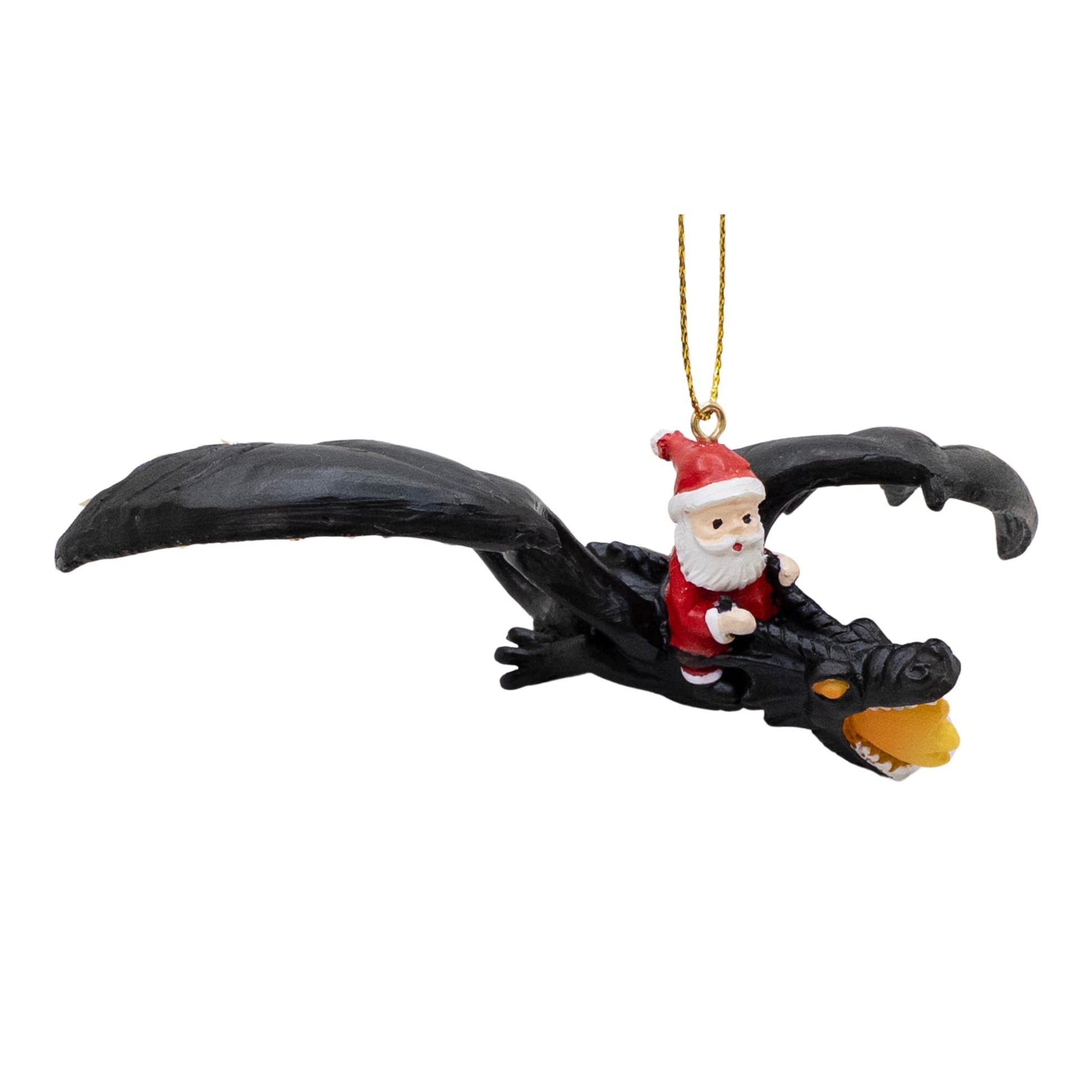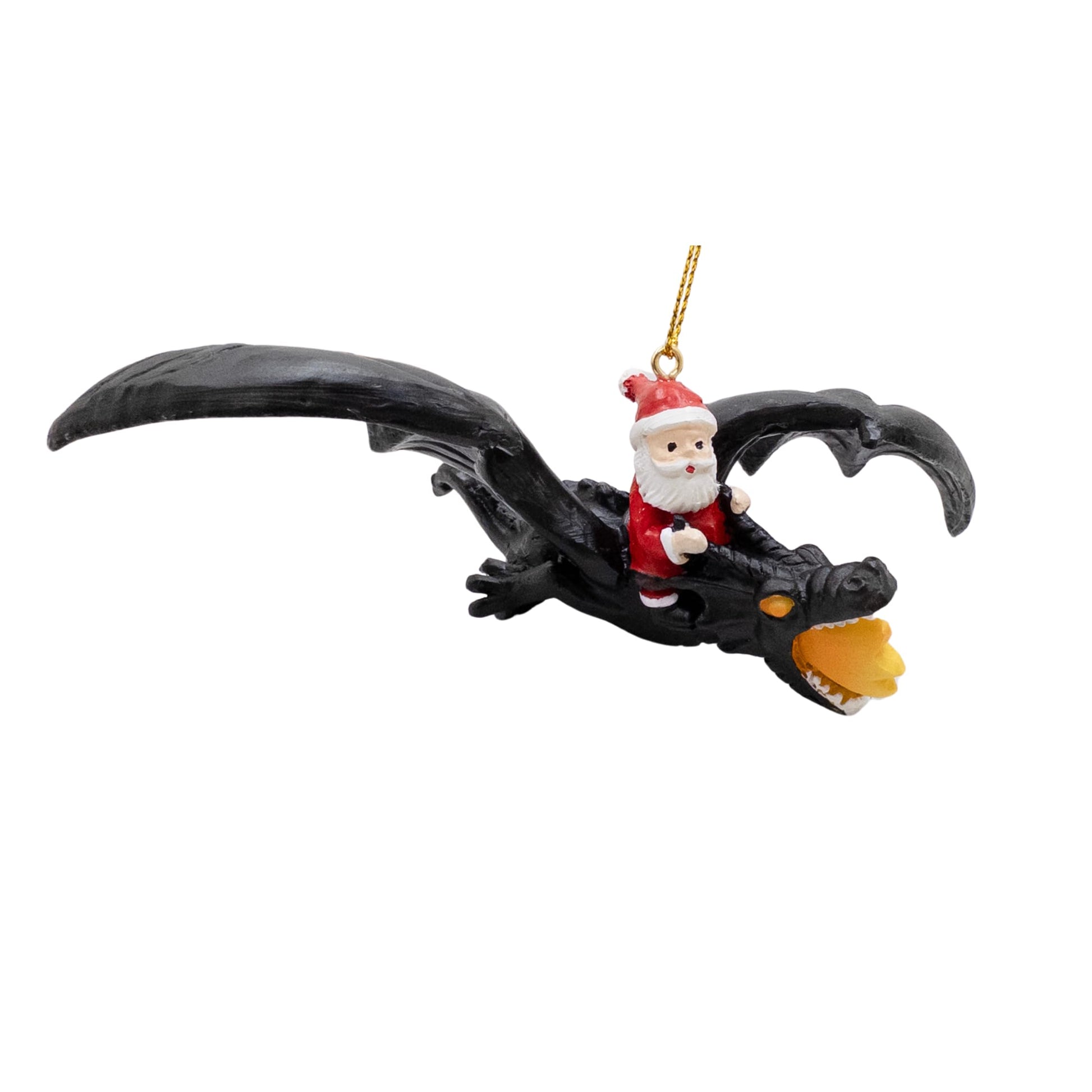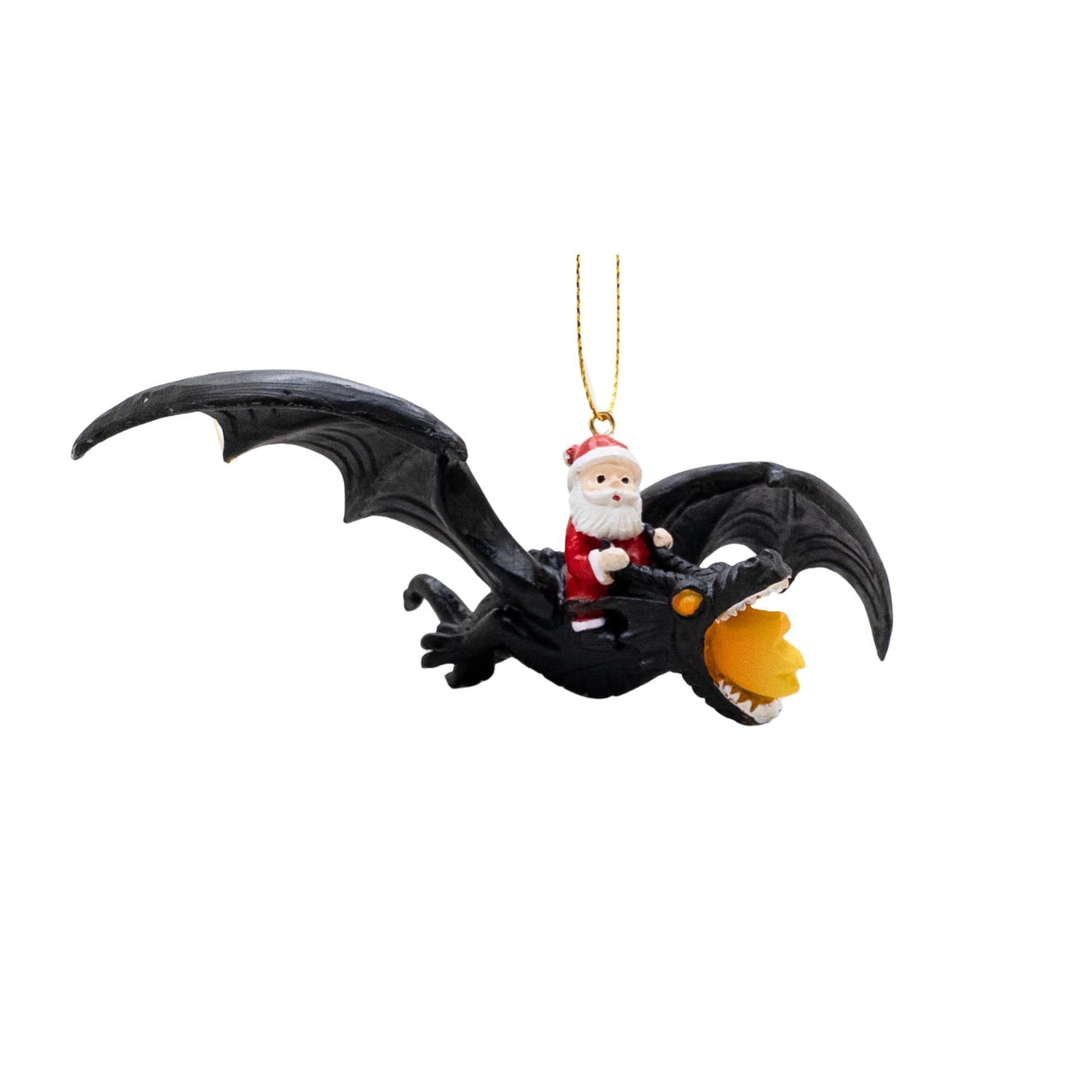 Details: Take your holiday decor to magical new heights with this Santa Claus Riding a Flying Dragon Christmas Tree Ornament! This imaginative ornament features Santa trading in his sleigh for a fierce and majestic dragon, soaring through the skies to deliver holiday cheer. With vibrant colors, intricate detailing, and a playful twist on tradition, this ornament is perfect for fantasy lovers and anyone looking to add an adventurous touch to their Christmas tree. Made from durable resin materials and designed for easy hanging, it’s a standout piece that combines the wonder of Christmas with mythical magic. A unique and fun ornament that’s sure to be a conversation starter during the holiday season! Weight 1.9 ounces Size in inches 1.5 in height, 6" in length, 3.75 in width