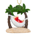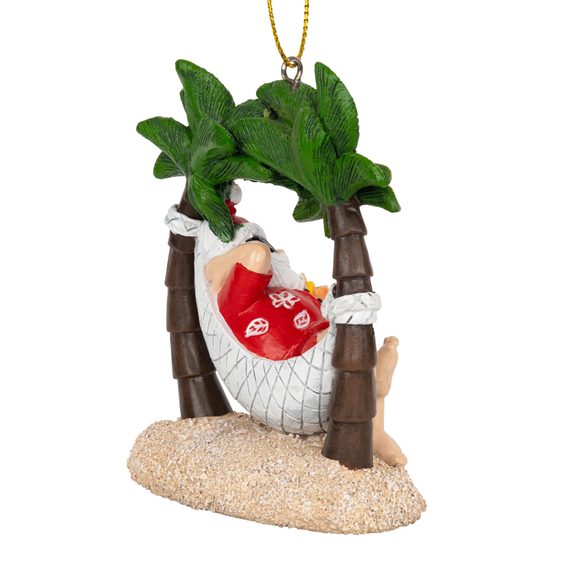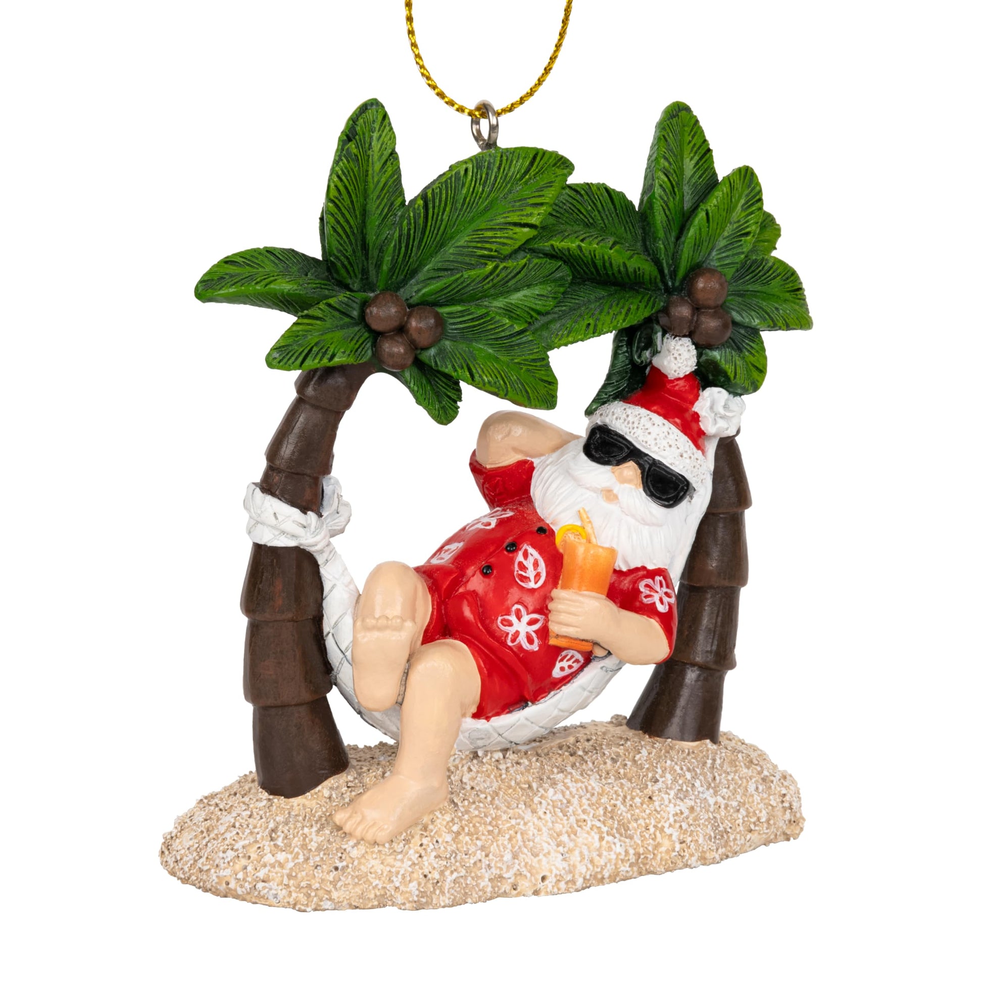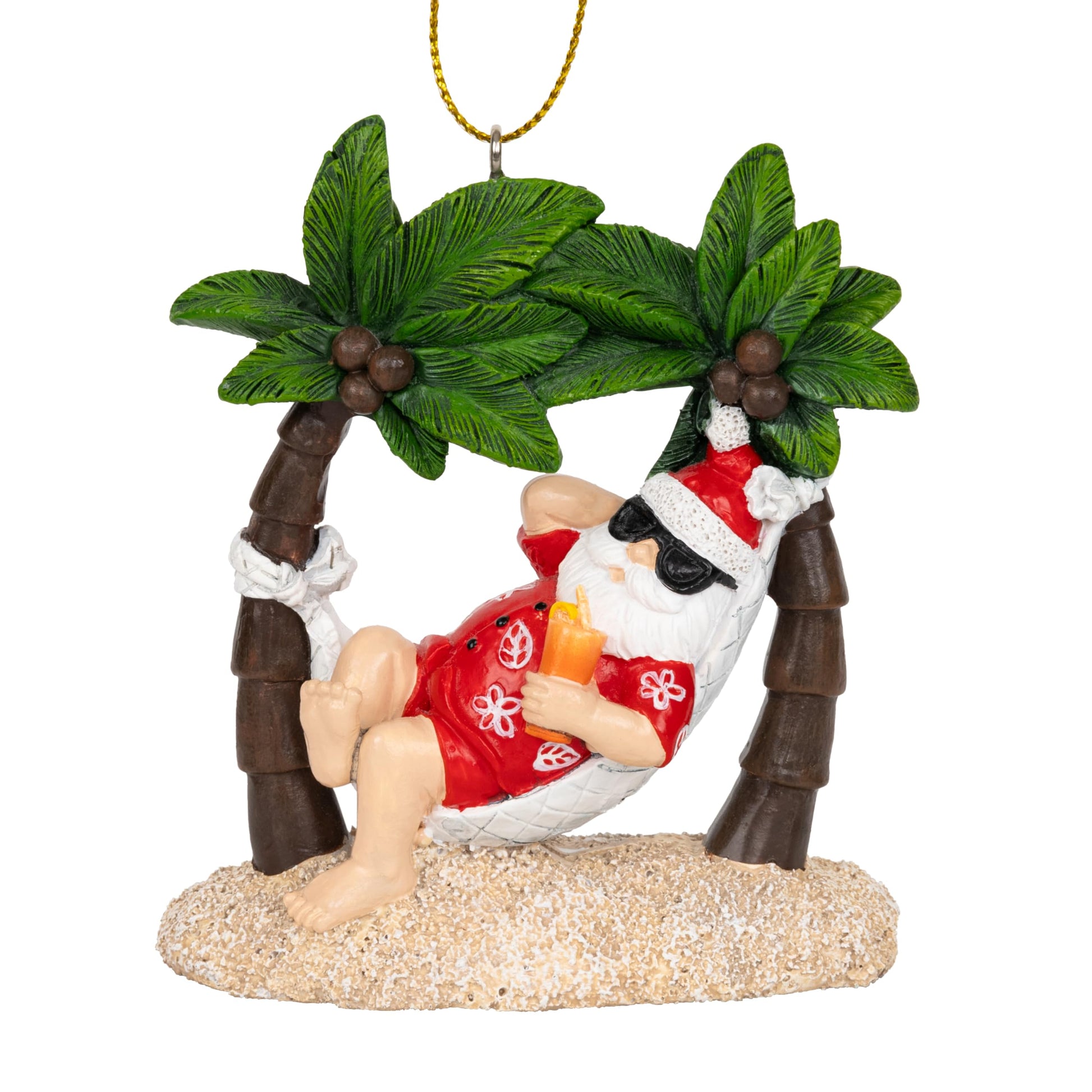 - Crafted with intricate detail, this ornament depicts Santa Claus lounging between two palm trees on a hammock, taking a well-deserved break from his busy gift-giving schedule. With his iconic red suit and hat nearby, Santa exudes tranquility as he enjoys a moment of peace under the swaying palms.