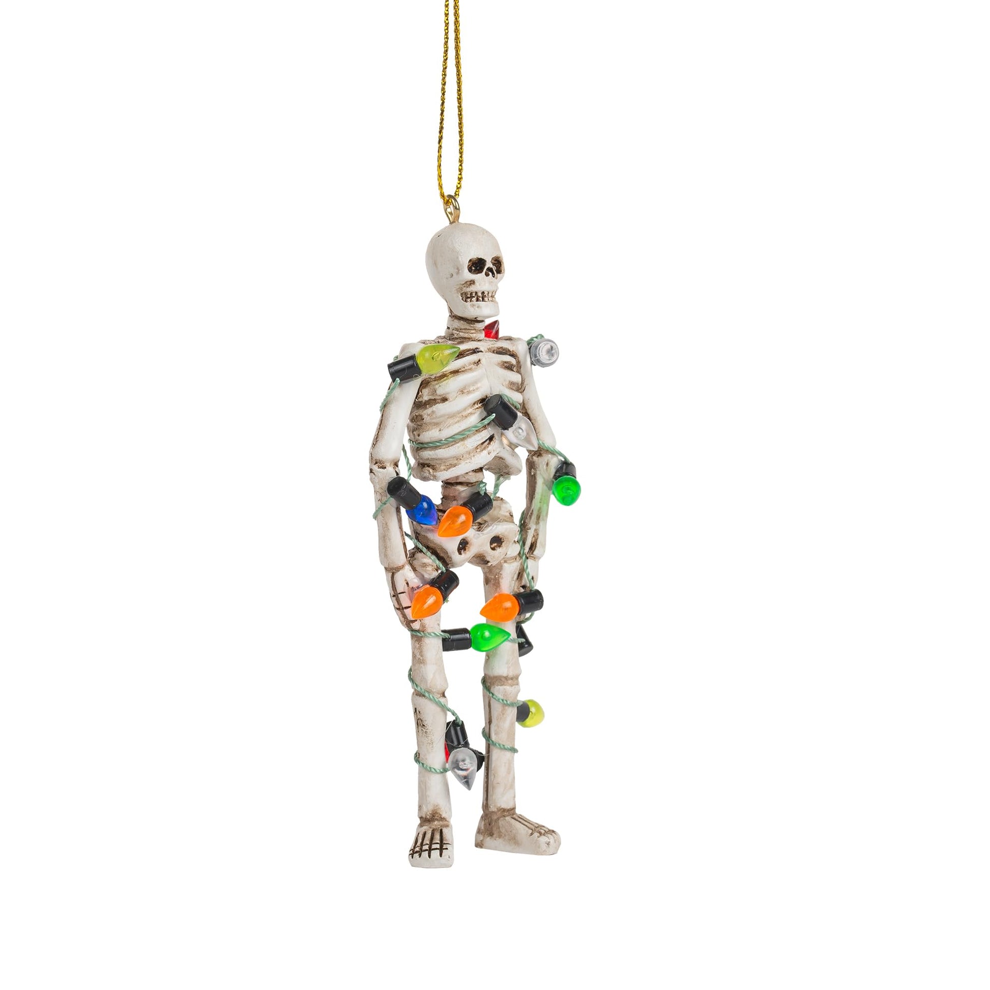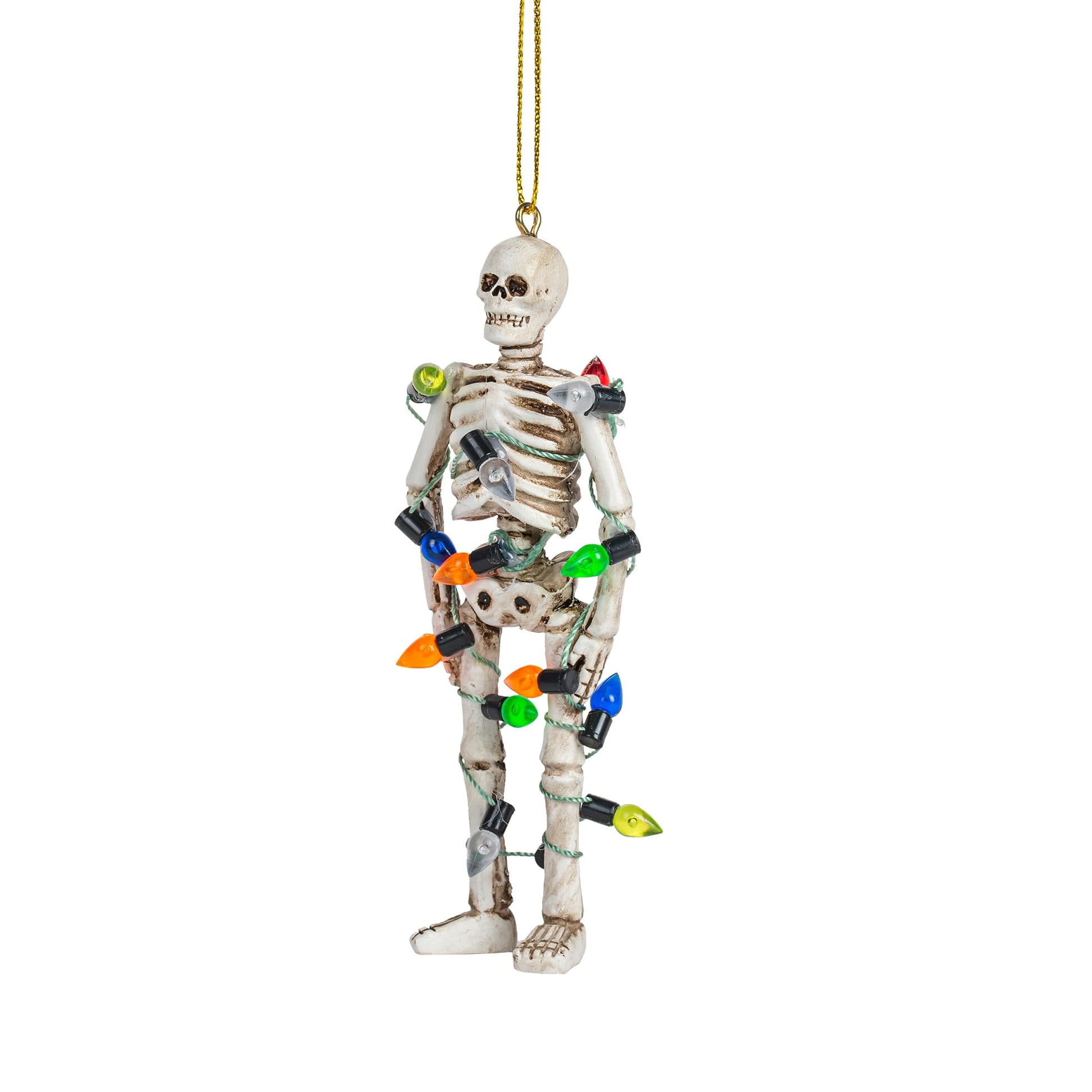Details: Celebrate the season with the spirit of whimsy and surprise embodied in our Skeleton Wrapped in Christmas Lights Ornament. It's a delightful reminder that even in the spookiest of times, the magic of the holidays can shine brightly. Size 4 1/2" inches in height by 1 5/8" inches in length