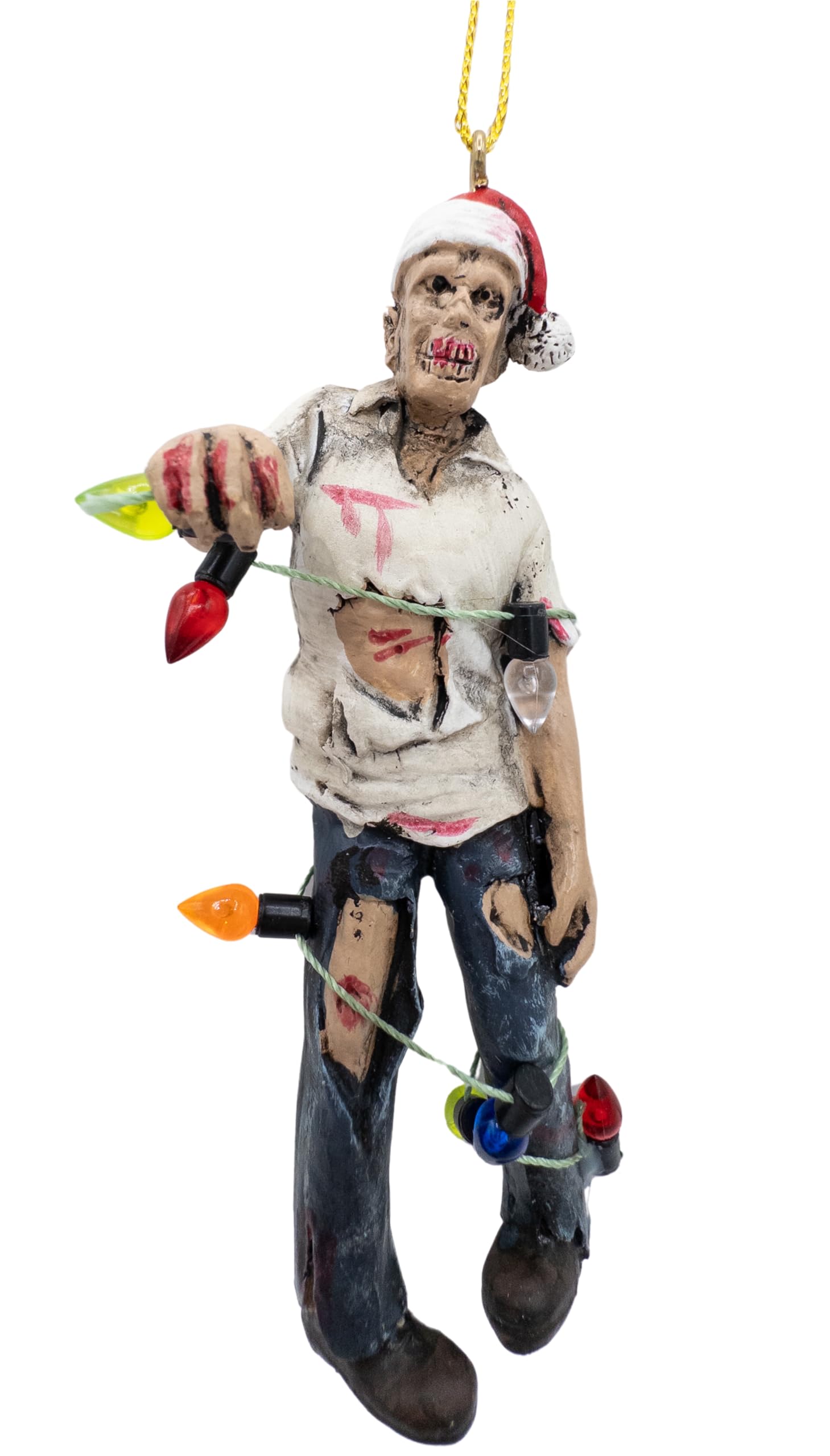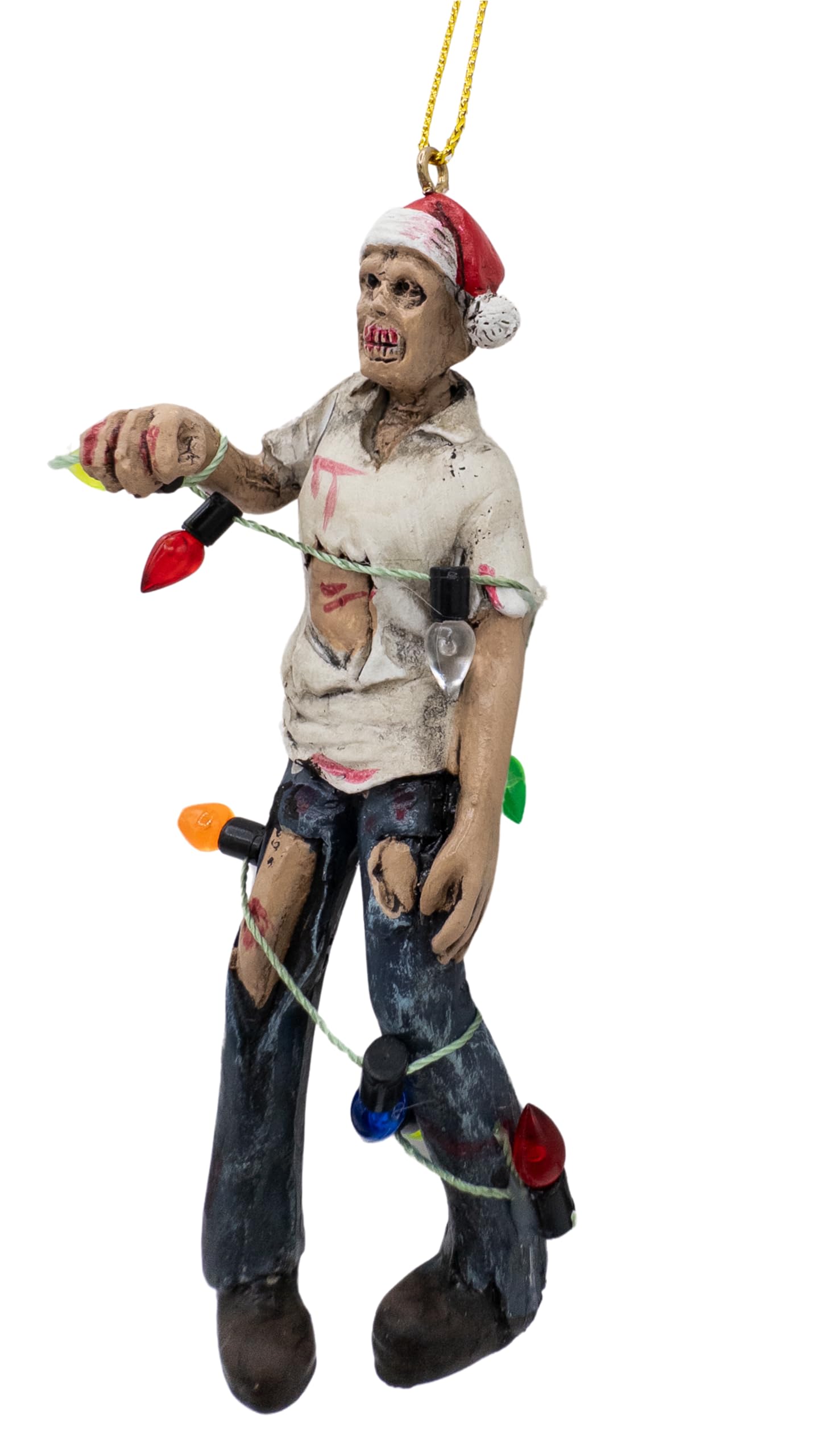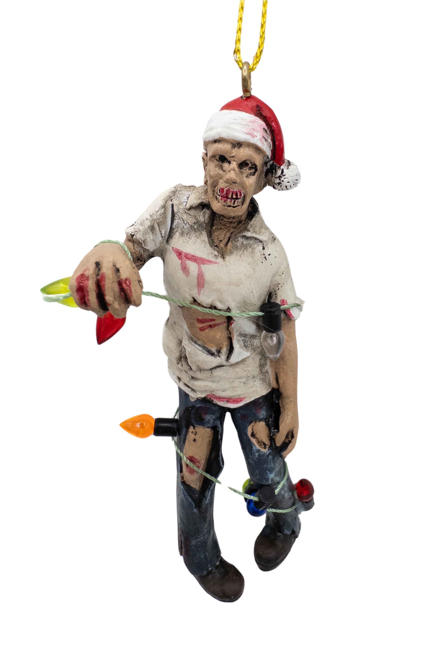 - Crafted with intricate attention to detail, this ornament features a delightfully creepy zombie figure dressed in festive attire, complete with tattered Santa hat and Christmas lights .