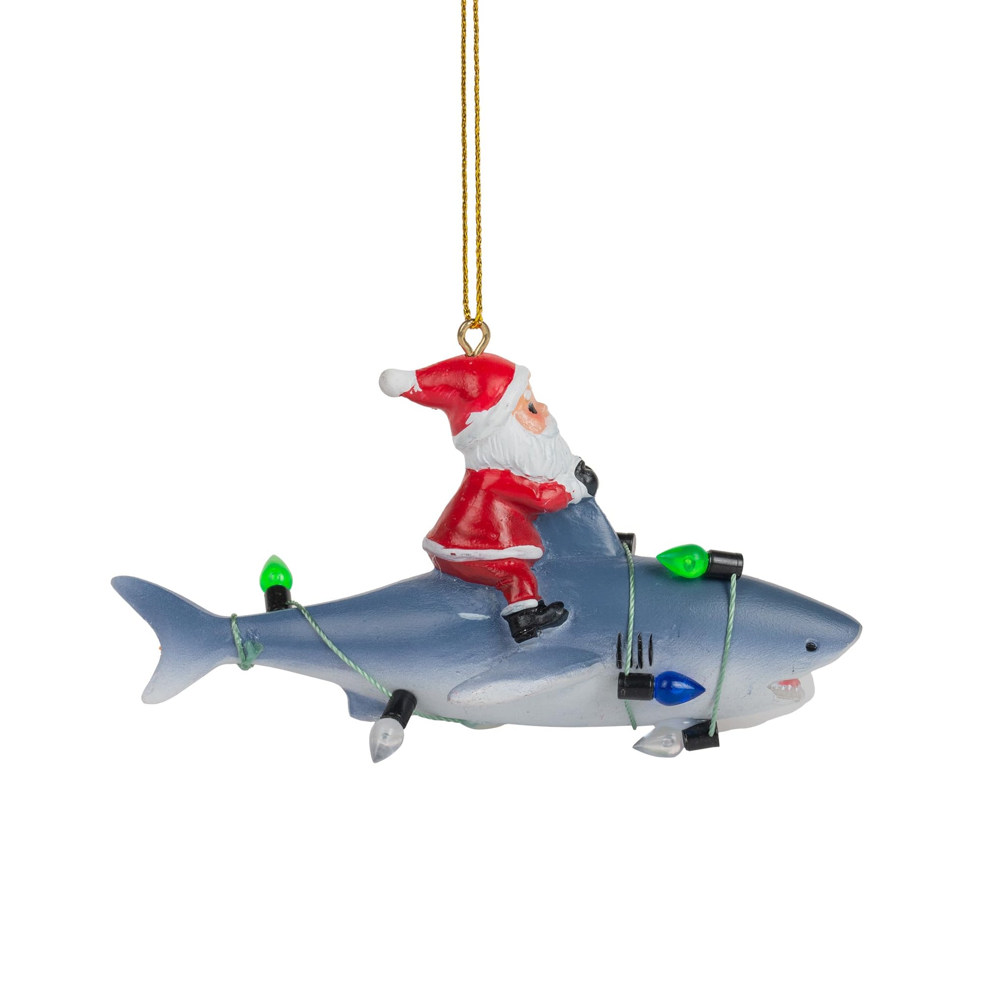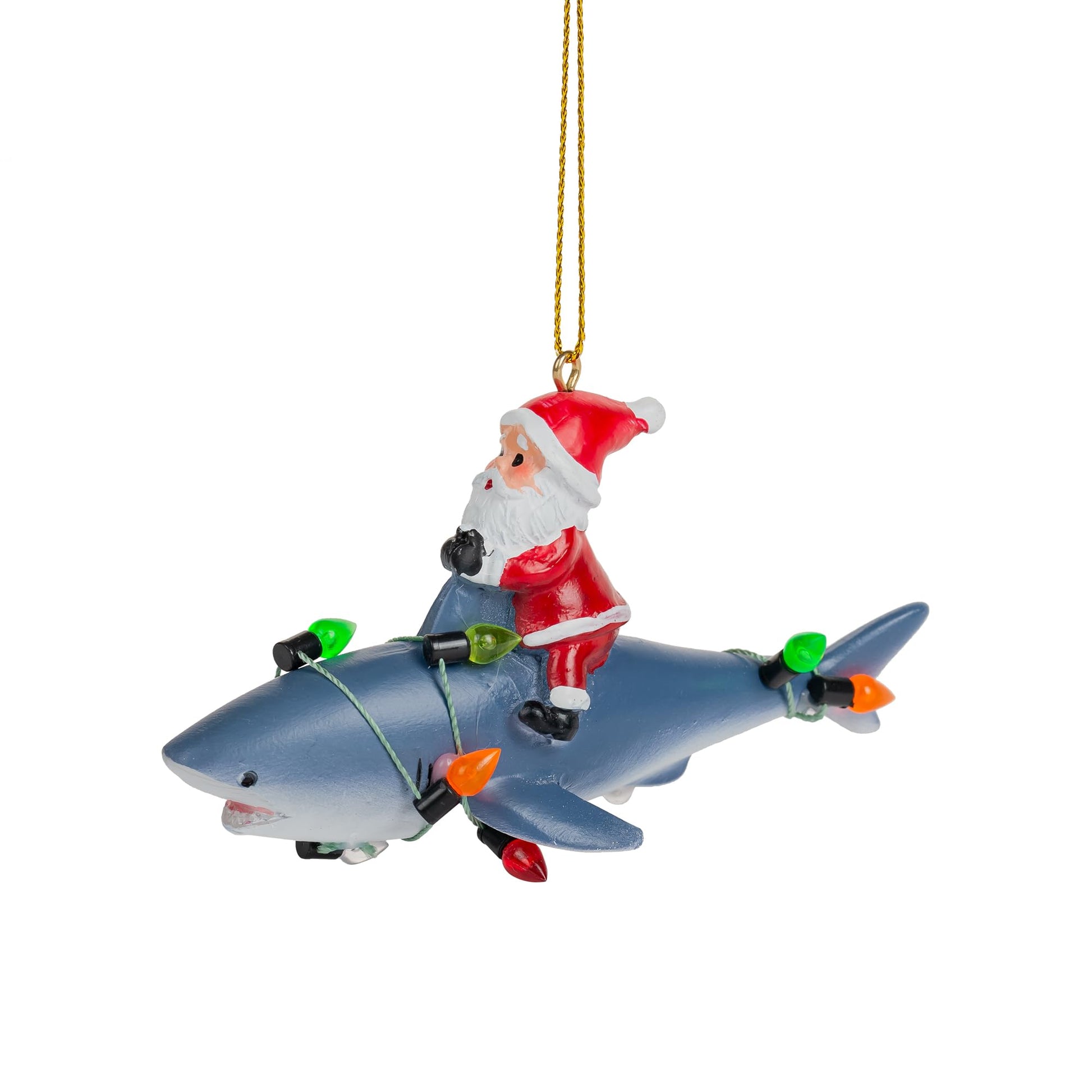 - Aqua Adventure: Santa Riding Shark Ornament brings a splash of holiday fun with Santa fearlessly surfing on a shark.