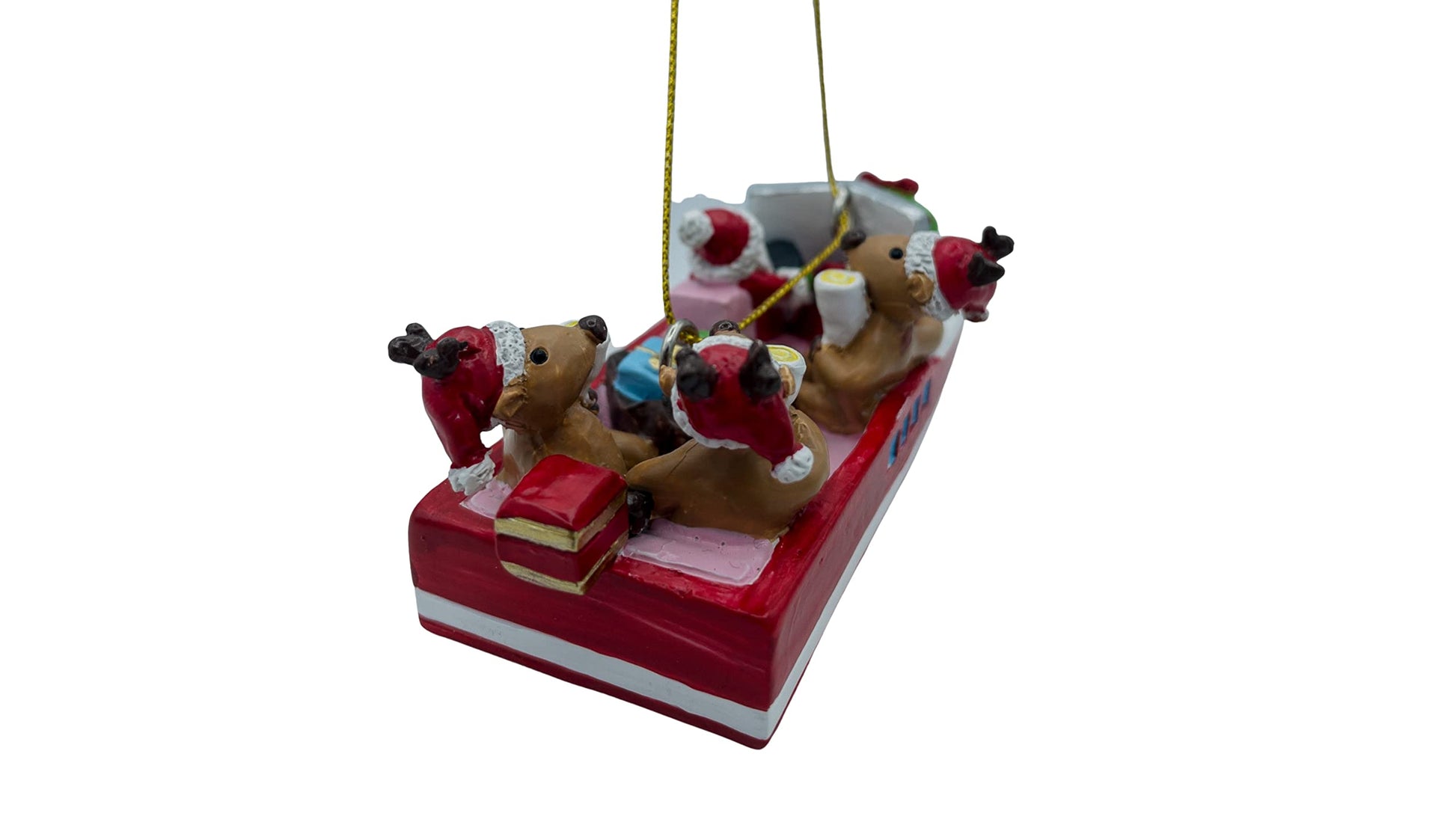 Details: This is a great Christmas ornament of Santa partying with reindeer in a speed boat. The size is 1 3/8" inches height by 4 3/4 inches length. December Pets is the place for all kind of different ornaments and pet gifts